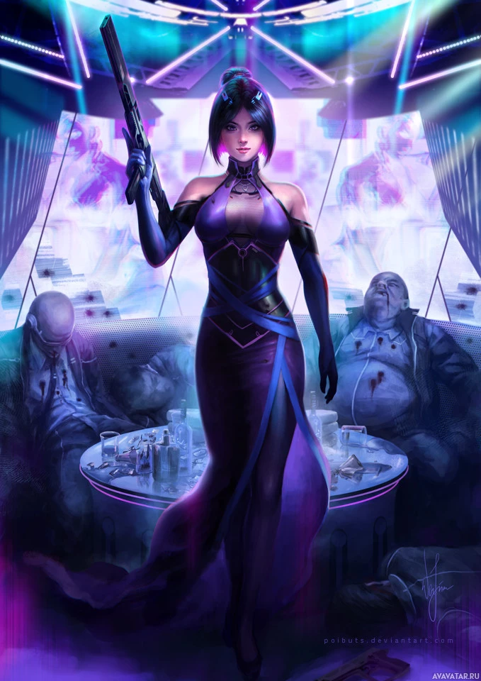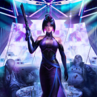 purple dress with a cape and holding what looks like a handgun pointed downwards at her side. In the background, there are two men sitting at a table; one seems to be wearing a mask that suggests he might represent a character from the game. The setting appears to be a futuristic or cyberpunk environment with