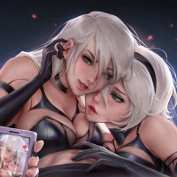 the video game "Nier: Automata." These characters are depicted with exaggerated features and a fantastical style, which is common in