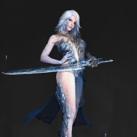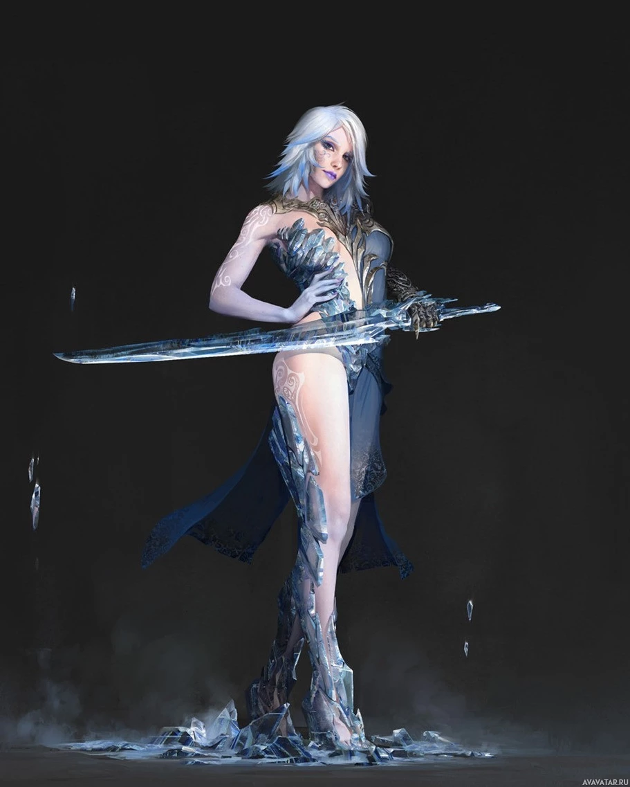 white hair, and is wearing a detailed costume made of ice or crystal-like material, which suggests she could be a figure related to the Fae or another mythical being from folklore. The character holds two swords crossed in front of her body, indicating she might have a warrior or