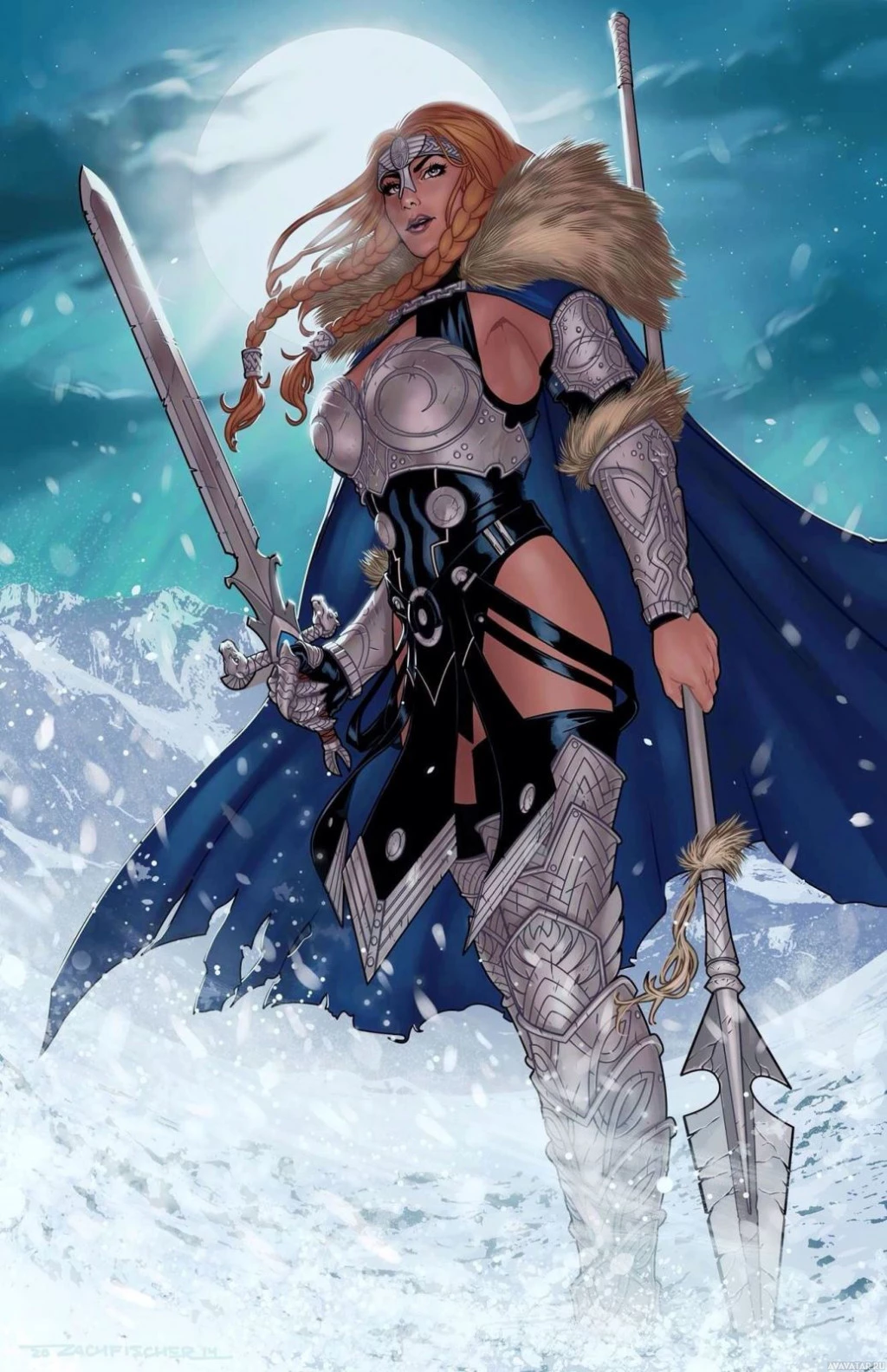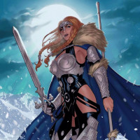a female warrior standing in what appears to be a snowy, winter environment. She is wearing armor that includes a breastplate and shoulder guards, with a cape draped around her shoulders. Her helmet has a visor, and she holds a sword in one hand. Her hair is styled flowingly, suggesting movement or motion. The background features a dark sky with