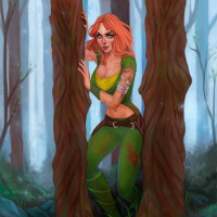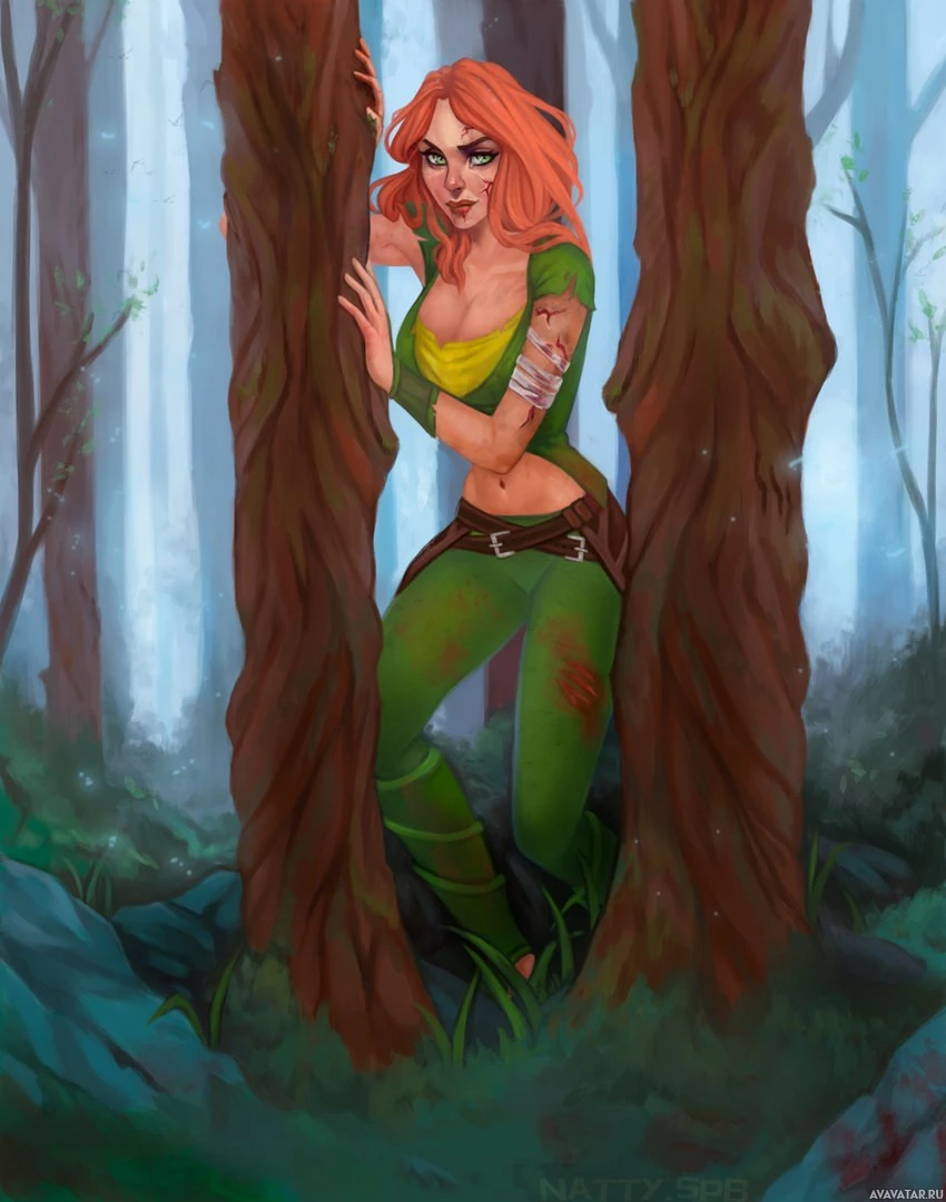 a female character dressed in green armor with red hair, standing amidst what appears to be a forest setting at night. Her expression is intense or focused, and she seems to be looking out into the distance. The character is identified as Windranger from