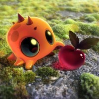 a red apple with a green leaf attached to the top. The creature appears to be interacting with the apple as if it were holding or tasting it. There are no berries or cherries visible in this picture.