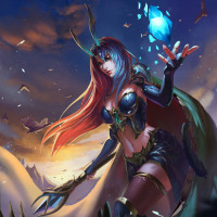 red hair and is wearing armor with a fantastical design, including elements that resemble feathers or wings. There are also magical orbs at her feet and around her, suggesting she may have some sort of