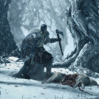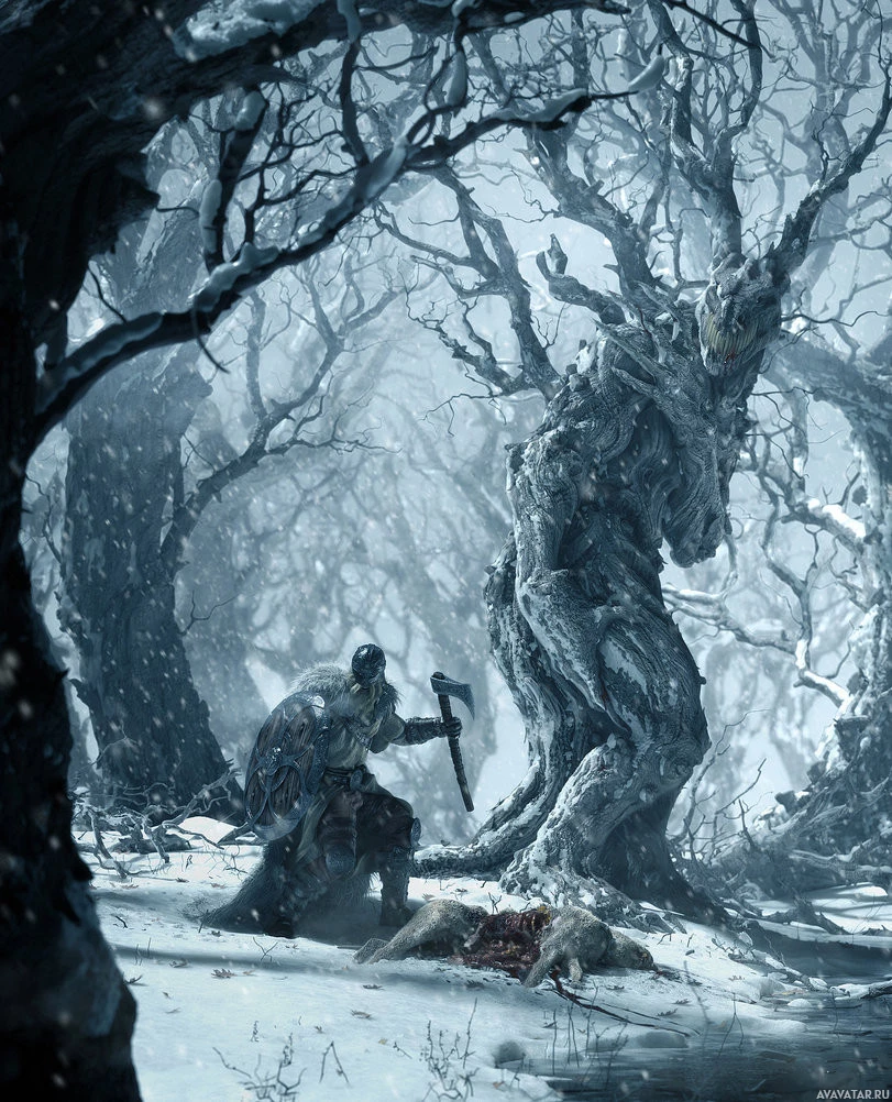 stormy weather given the dark skies and snow-covered trees. The scene has a fantasy or historical atmosphere, which could suggest that this is a digital artwork depicting a moment from a story or mythological narrative involving a warrior and their encounter with a beast in