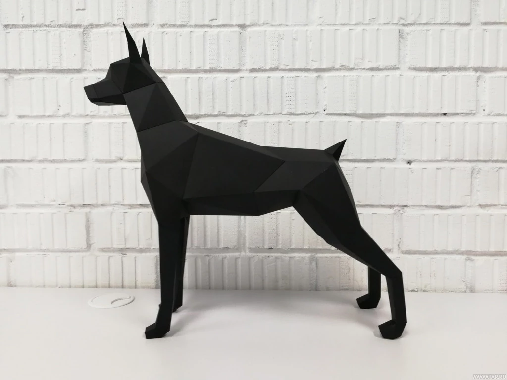На снимке изображена трехмерная модель черной собаки. Это, по-видимому, бумажная или картонная вырезка, часто используемая для декоративных целей или образовательных мероприятий.