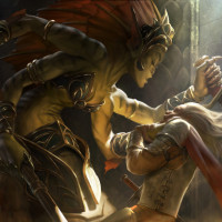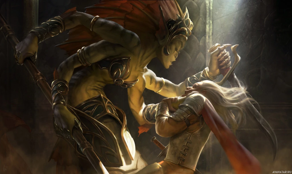 a fantasy scene featuring two characters engaged in what appears to be an intense confrontation. One character is depicted as a menacing figure with