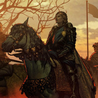 medieval armor, some of whom are on horseback. The setting appears to be during sunrise or sunset, given