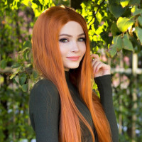 The image shows a young woman with red hair. She is wearing a dark turtleneck sweater and has her hand on her hip, posing for the photo. Her expression is friendly and she appears to be outdoors under some foliage. It's difficult to determine if she is a celebrity or not based solely on this image without any context or additional information.