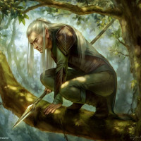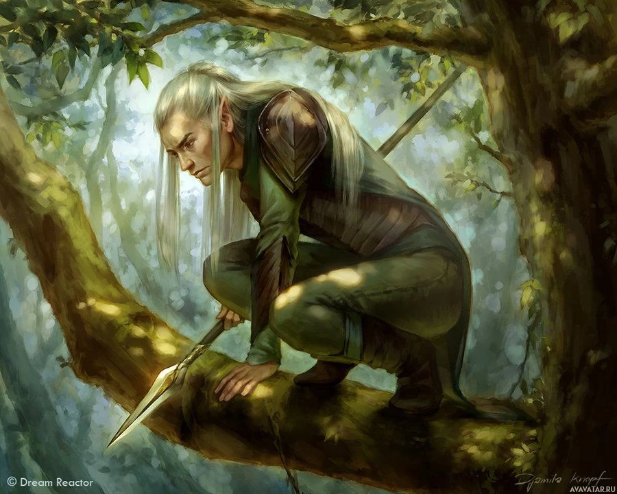fantasy art, portraying an elf in an action pose. The elf is wielding a lance and appears to be crouched on
