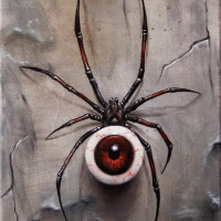 dark colors. This artwork may convey themes associated with horror or the macabre due to the presence of the eye within the spider's body.