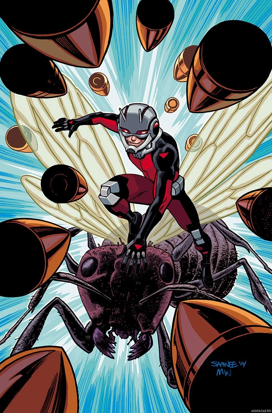 the middle of combat, with bees around him and a giant ant on his shoulder. Additionally, there are bullets flying through the air, indicating some form of attack or battle. This illustration captures