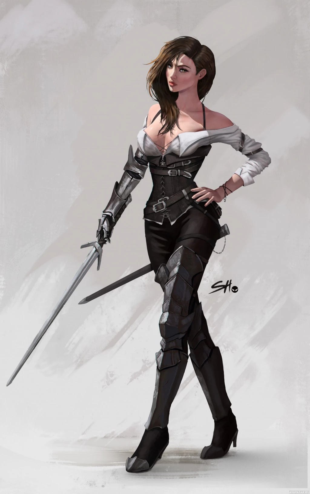 На картинке изображен иллюстрированный персонаж, вероятно, из фэнтези или средневековой обстановки. Она кажется женщиной-воином или авантюристом, изображенной в динамической позе с одной рукой на бедре, а другой с мечом. Ее одежда включает в себя доспехи, которые предполагают сочетание элегантности и боевой готовности. Художественный стиль детализированный и реалистичный, захватывающий чувство движения и готовности.