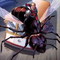 The image depicts a comic book style illustration featuring the character Ant-Man riding on top of an ant. Ant-Man, real name Scott Lang, is shown in his