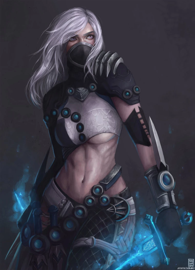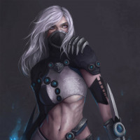 an energy blade or gun in the other. Her expression is serious, and she seems ready for combat. This image could be related to