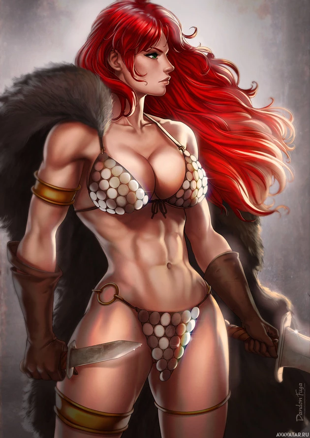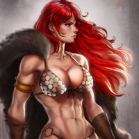 a female character with red hair. She is depicted wearing a bikini-style top and armor, suggesting a fantasy or comic book theme where she might be a warrior or an adventurer. She holds a sword in her right hand, and the background gives off a dark, perhaps medieval or