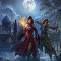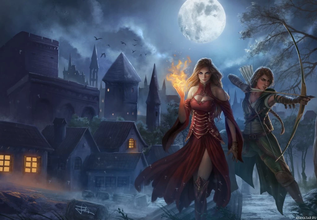 green armor and wielding a bow, ready for action. This character also appears to be focused on something in front of them. The setting includes a dark landscape with a full moon visible overhead against a cloudy sky. There are also glowing points of light that resemble eyes from the shadows, adding to the eerie atmosphere. The architecture in the background suggests a medieval or fantasy-inspired village or town.