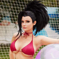 black hair and is wearing a red bikini. Her makeup includes dramatic