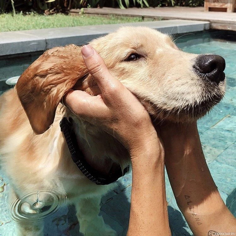 retriever dog. The dog is in the water, and the person has their hand on the dog's head, gently petting it. Both the person and the dog are enjoying each other's company by a pool, which suggests they may be participating in some form of