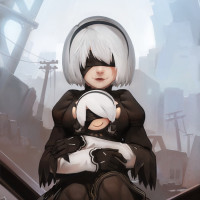 industrial structures around her. 2B is wearing