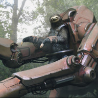 a forest setting, which contrasts with its industrial appearance. The scene also includes what looks like an animal, possibly a sloth, resting on top of the robot or interacting with it, creating a juxtaposition between nature and technology.
