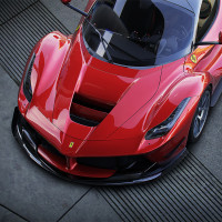 The image shows a red Ferrari car, specifically a model known for its performance and luxury. It appears to be a modern sports car with a sleek design, possibly designed by Pininfarina, which is known for its work on high-end vehicles.