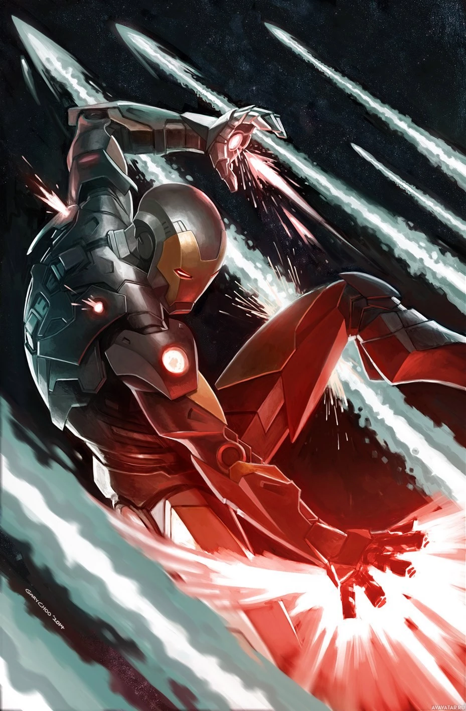 Iron Man, who is known for his armored superhero persona. This particular depiction of Iron Man seems to be in the middle of