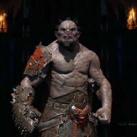 a fierce expression on his face and is holding up a weapon that looks like a large hammer or mallet. The setting appears to be a dark,