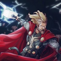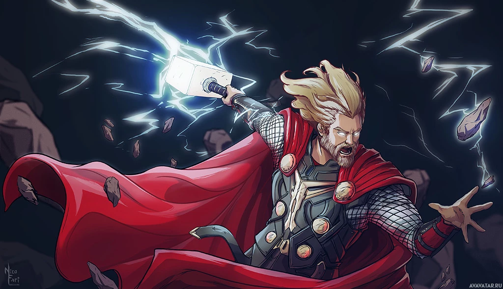 На картинке изображен Тор, персонаж из Marvel Comics. Он показан в боевой позе с поднятым над головой молотом, излучающим молнию и энергию. Тор одет в свой традиционный красный плащ и за ним текут длинные светлые волосы.