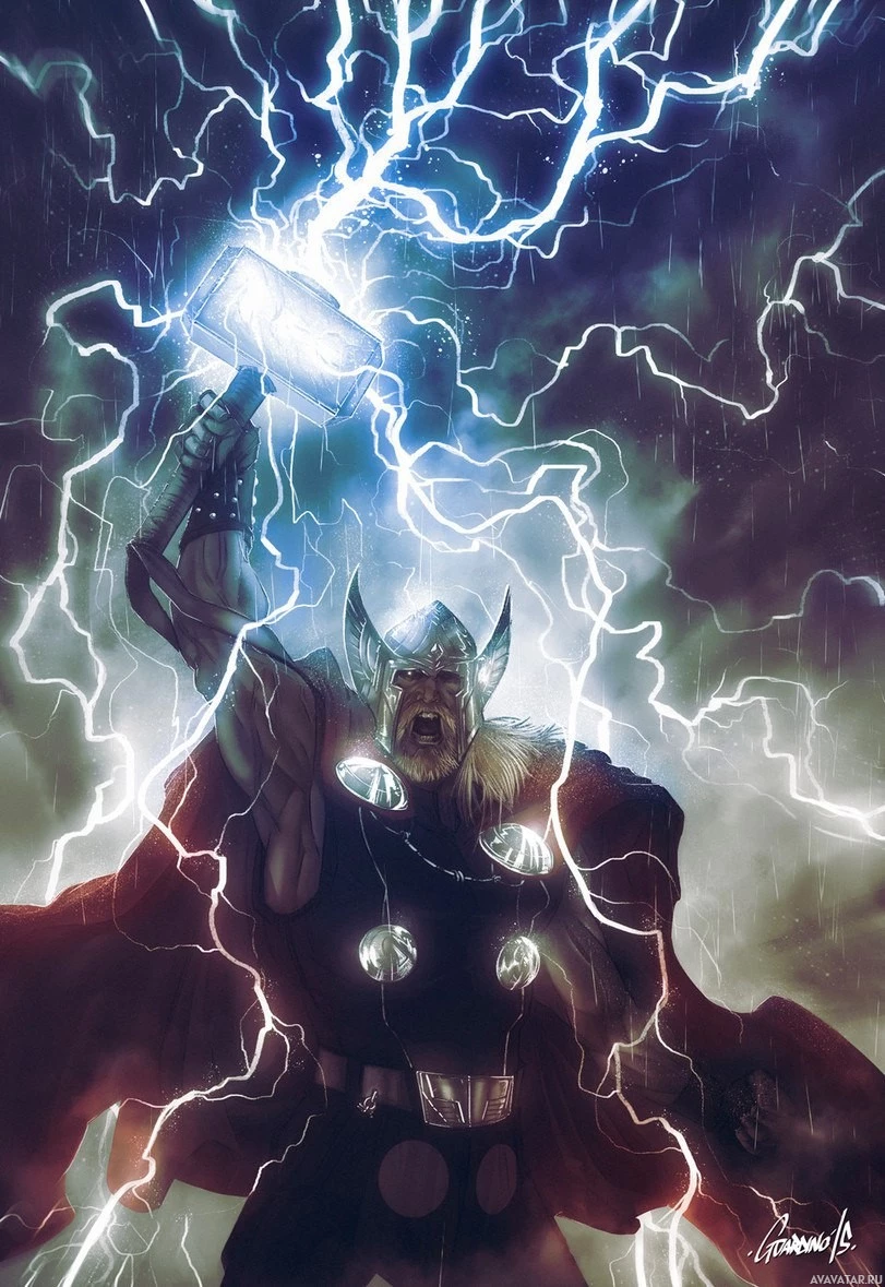 a stormy sky filled with powerful lightning bolts. Thor's muscular form and