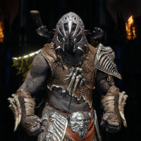 a menacing expression and is wearing armor that includes a helmet with a spike, a chest piece with spikes on the back, gauntlets, and boots. The character has