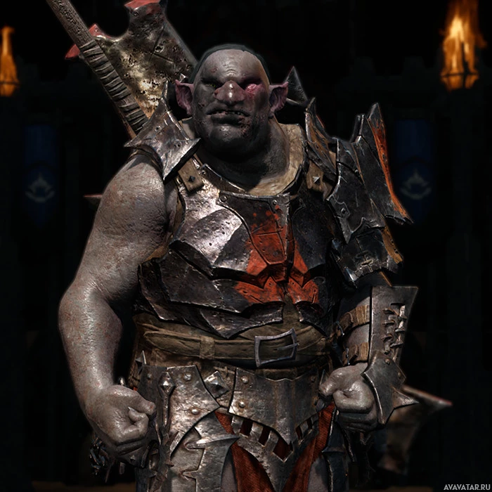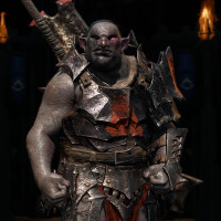 game characters, depicted with detailed armor and weaponry. The character appears to be a muscular individual wearing metal armor with