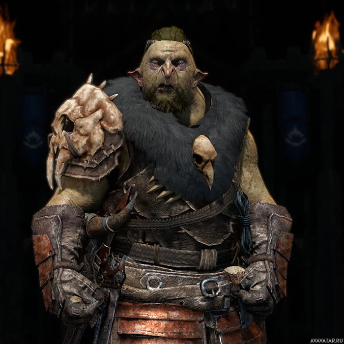 green skin, fangs, and tusks, which are characteristic features of the orcs in the "Warcraft" universe. He is wearing heavy armor, with