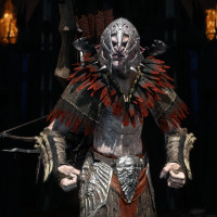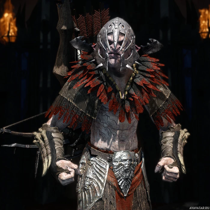 a face mask or a skull on it. He is wielding a bow and arrow, which suggests he might be engaging in combat or preparing to do so. The environment appears to be a dimly