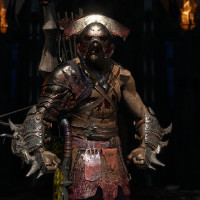 a Viking warrior, wearing armor that appears to be made of metal and leather with some bloodstains on it. He also has a helmet with what seems to be