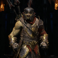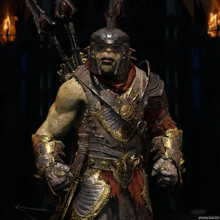 the bosses in the game. He is dressed in armor with a helmet that resembles a skull, giving him a menacing appearance. The character is holding two large, curved weapons, which are likely part of his