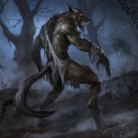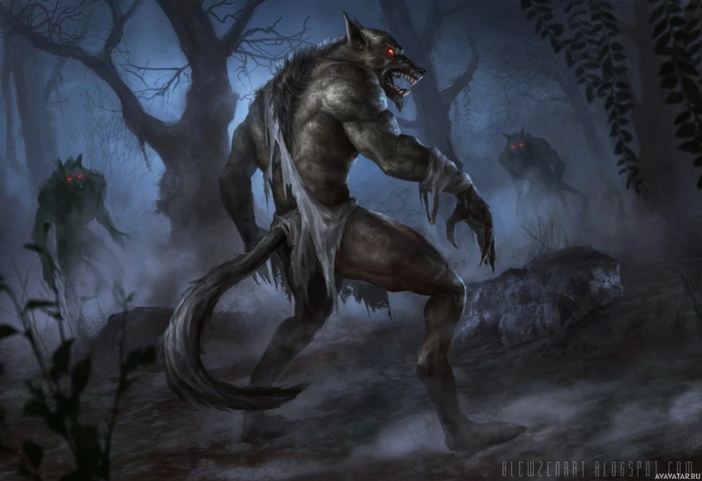a fantasy scene with werewolves. From behind, there are two