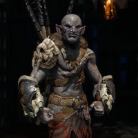 a gruff expression and is wearing armor with spikes or some sort of decorative element on his shoulders. He also seems to have a weapon attached to his back. The environment suggests a dungeon-like setting, with stone walls and what appears to be torches in the background providing