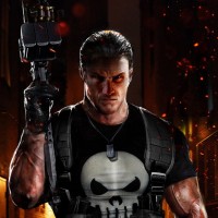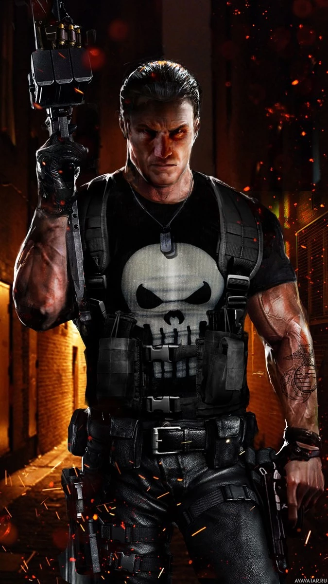 The image features a character known as the Punisher, who is depicted wielding a weapon. The character is wearing a tactical vest with