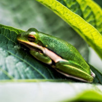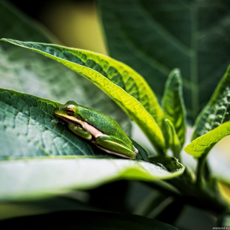 На снимке изображена зеленая лягушка, покоящаяся на листе. По-видимому, это насекомоядные, вероятно, питающиеся более мелкими насекомыми, которые можно найти в таких средах. Фон не совсем ясен из-за фокуса на лягушке и листе, на котором она сидит.