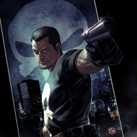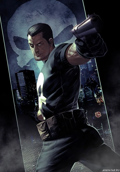 The image shows a stylized representation of the Punisher, a fictional superhero character from