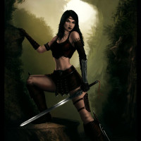 warrior attire. She is holding a sword, which suggests she might be portraying a character from a story or role-