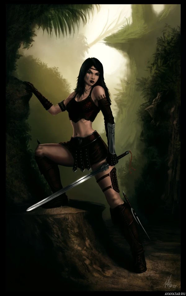 playing scenario where swords are used. Her outfit includes armor and a helmet that could imply she is in a setting where combat is common. The background is lush with greenery, possibly indicating a jungle or