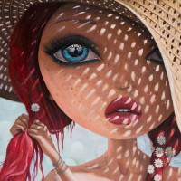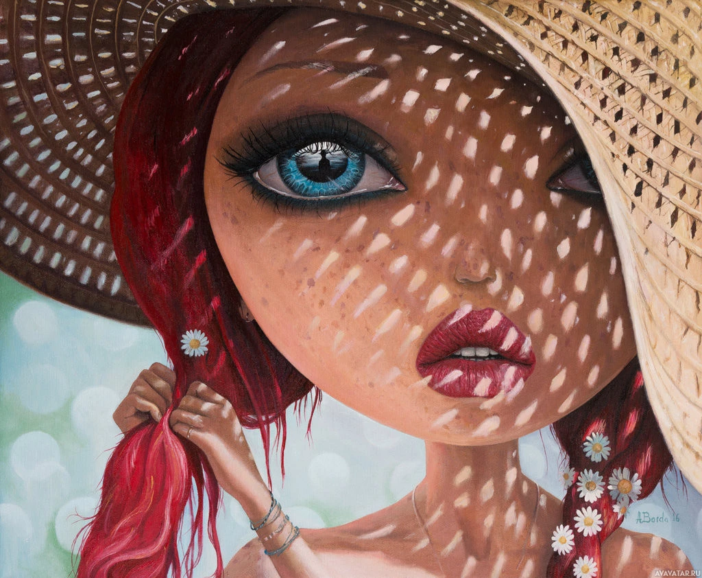 blue eyes and wears a large straw hat that provides shade, casting a patterned shadow over her face. The background appears to be outdoors, possibly near the ocean or a sea, given the presence of what looks like foam in the foreground. There are also white flowers with yellow centers, which could be dandelions, adding to the whimsical