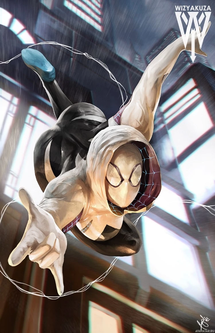 Gwen Stacy, a significant figure in Spider-Man's comic book storylines, depicted in her own distinctive costume. The image has been signed by the artist in the lower left corner with their initials "WZ" and features the logo of "Marvel Comics" at the bottom center, indicating that this artwork is part of the Marvel Comics universe.