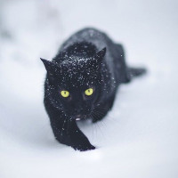 На картине изображена черная кошка. Похоже, что он находится снаружи во время снегопада, а снег покрывает землю и, возможно, кошачий мех из-за падающего снега.