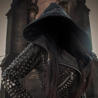 dark hair and are standing in what appears to be an outdoor setting with architectural elements that could indicate a historical or urban environment. The angle of the photo is slightly from behind the individual, adding an element of mystery as their face is obscured by the hood, which matches the jacket's color scheme. The person is dressed in clothing that seems to have a gothic or edgy