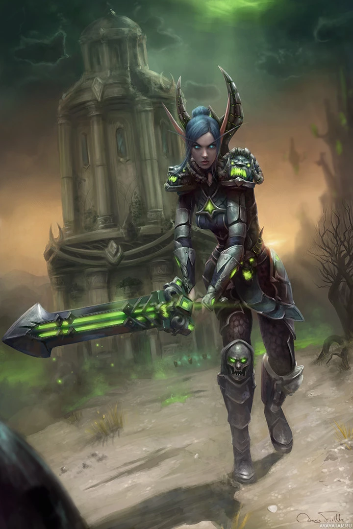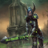 a video game or a digital artwork. The character is wearing armor and carrying a sword with a green blade, suggesting they may have some sort of