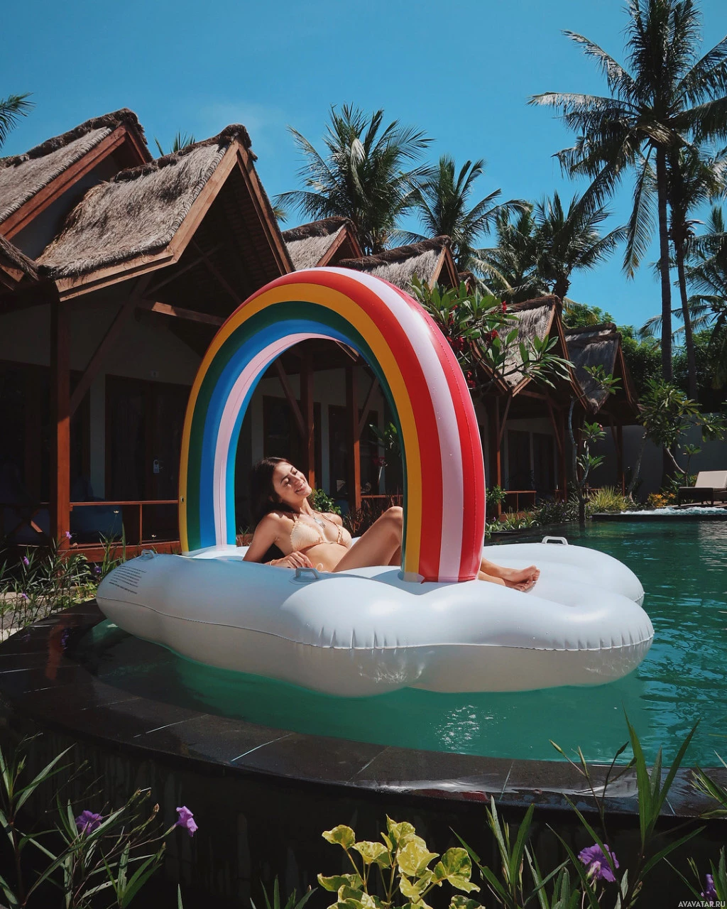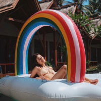 The picture features a woman lying on an inflatable rainbow ring that is placed in