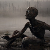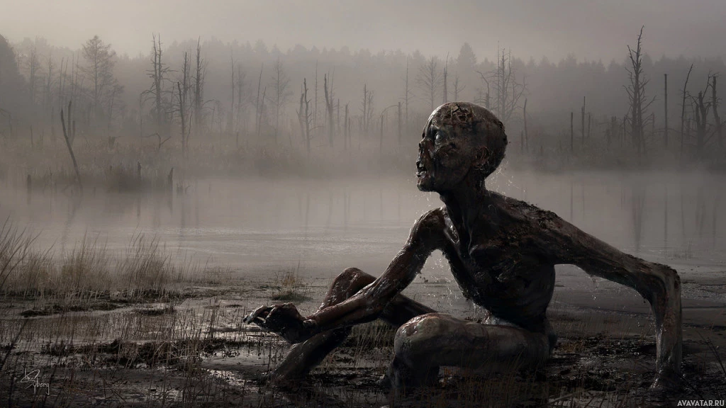 a desolate landscape with a figure sitting in the foreground. This figure appears to be a humanoid creature that looks damaged or decayed, suggesting it might be a representation of a zombie or a horrific scenario often associated with