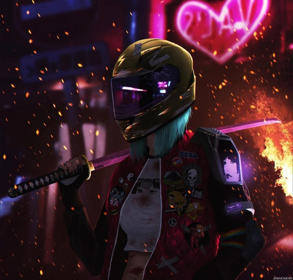 an urban setting, possibly a street or alley with neon lights and signs, including one that seems to be a heart symbol. There are also flames and sparks around her, which could imply she is either in